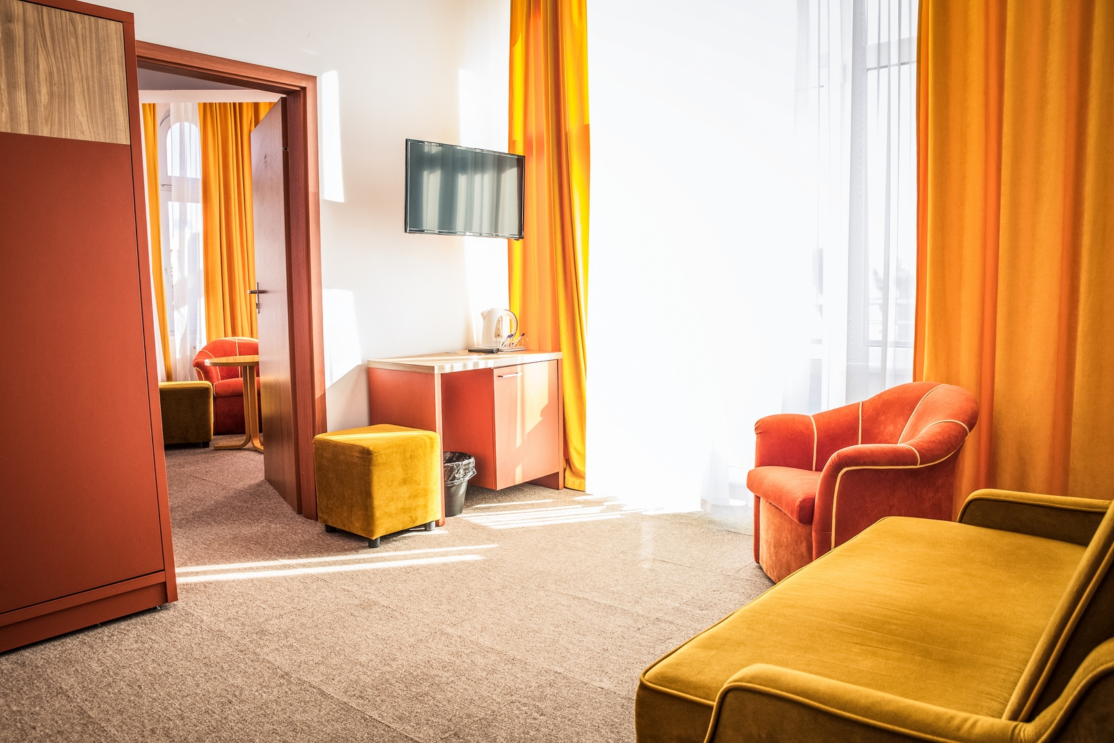 nie ma drzwi. Pokoje wyposażone są w łazienkę z prysznicem i suszarką, tv,